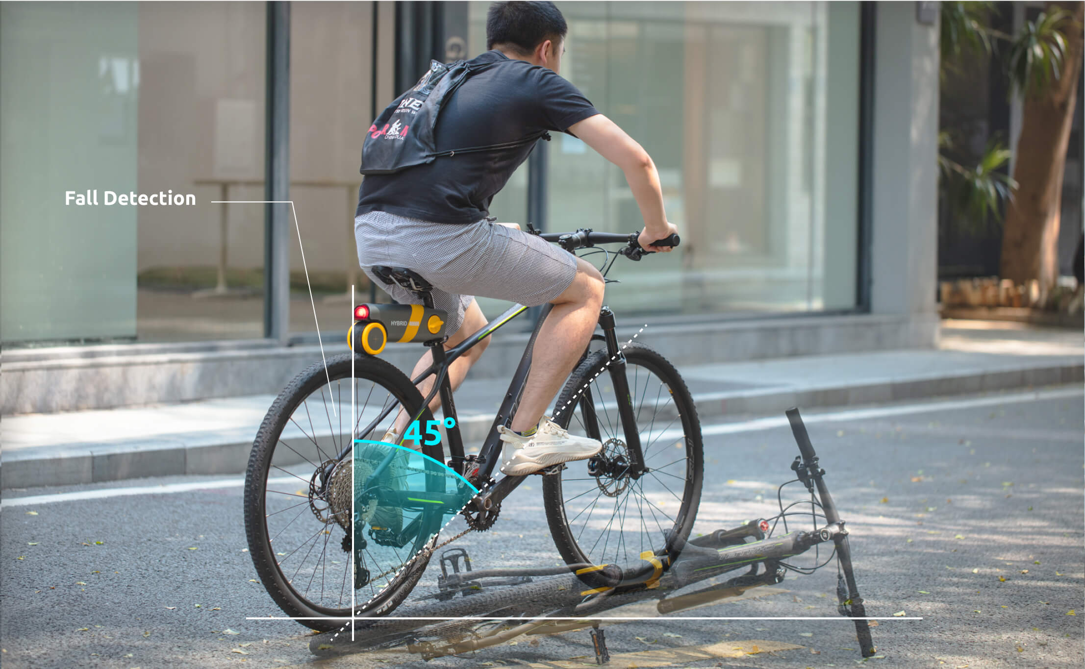 Road bike helmet equipped with 360°warning light, fall detection and SOS technology to ensure rider’s safety.